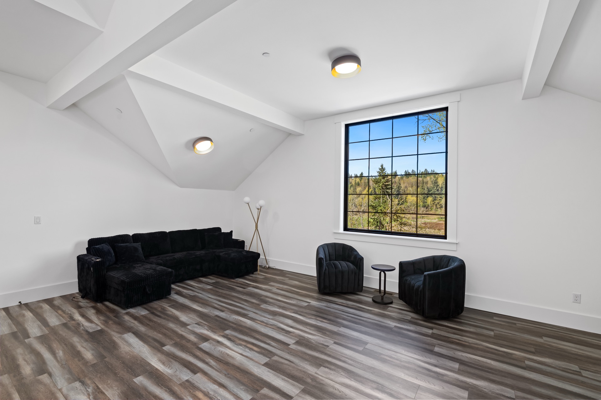 The Lodge is the estate's quietest room — a firelit lounge with a wide picture window framing the mountain view. Warm seating gathers close to the hearth; the rest of the world feels far away.