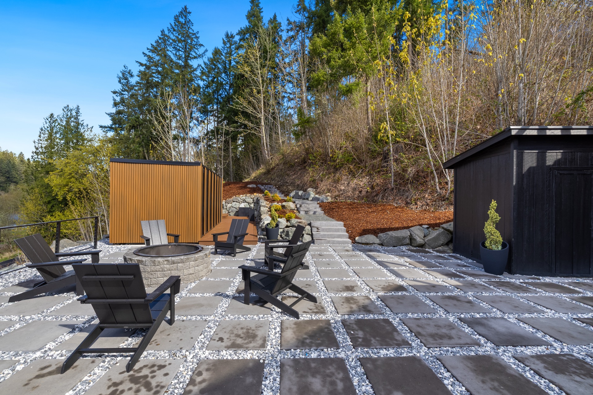 As the day fades, string lights and the fire turn the space into an enchanting evening venue. Perfect for ceremonies, cocktail hours, and al fresco dining under the trees.