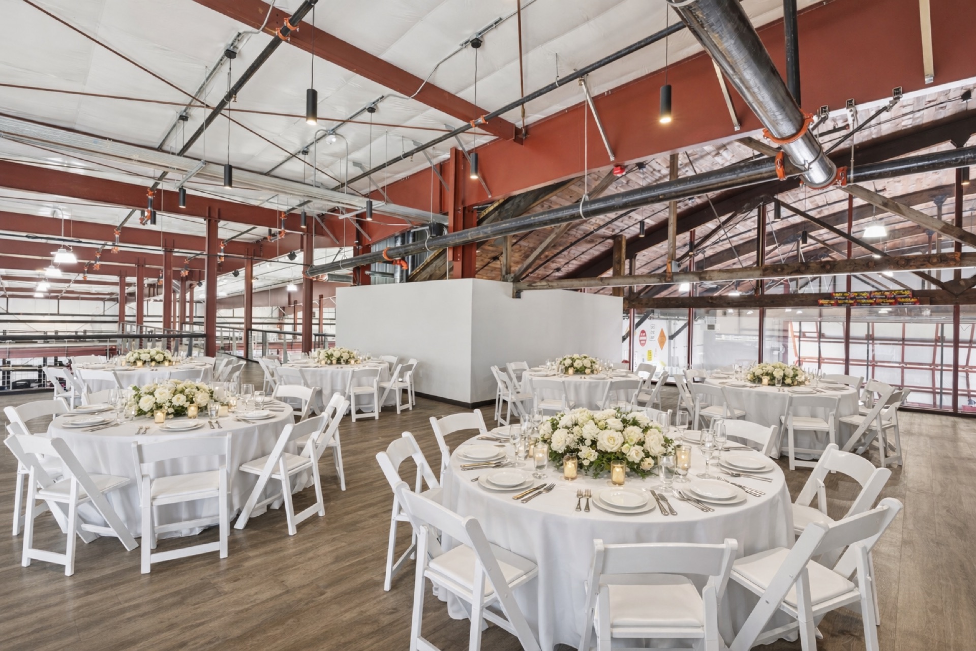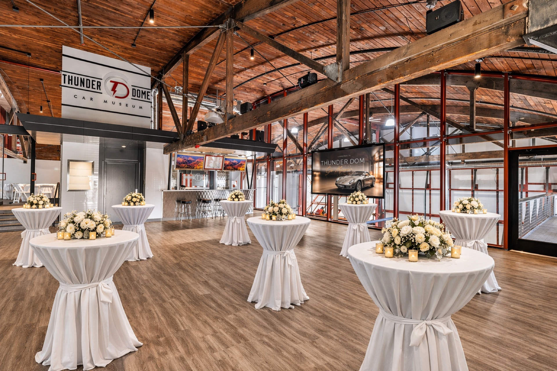 Round banquet tables, white linens, soft pendant lighting set against bold steel and timber — Thunder Dome dresses up for every kind of celebration without losing its signature architectural drama.